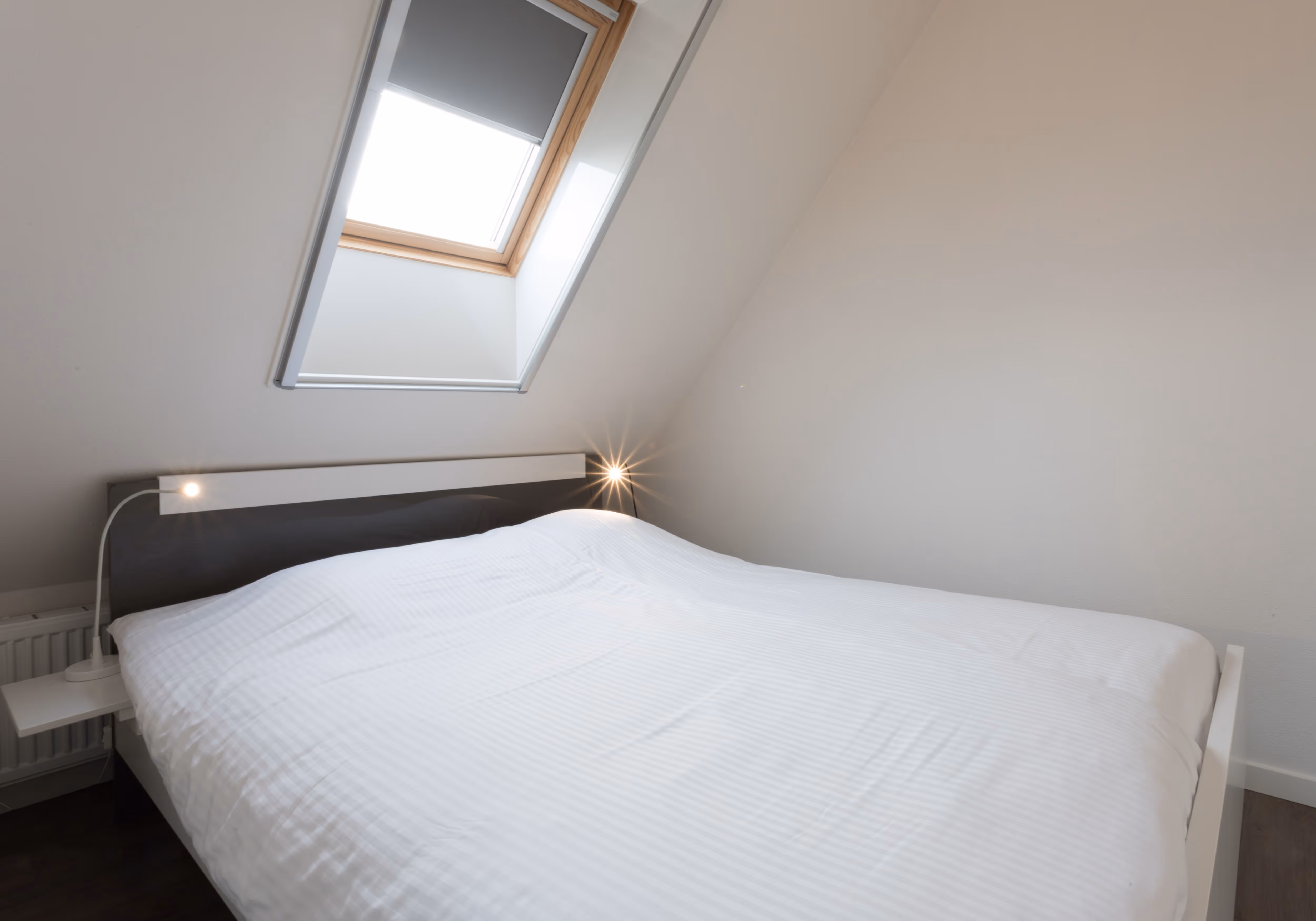 De slaapkamer is gelijkvloers met de woonkamer en beschikt over een tweepersoonsbed met hoogwaardige matrassen (1.60 x 2.10 meter). Uw bed is bij aankomst opgemaakt met fris linnen. Boven de keuken, badkamer en slaapkamer is een slaapzolder, deze is te bereiken via de ladder. De ladder kunt u inschuiven, waardoor hij geen ruimte inneemt in de woonkamer. Op de slaapzolder staat een eenpersoonsbed ( 0.90 x 2.00 meter)