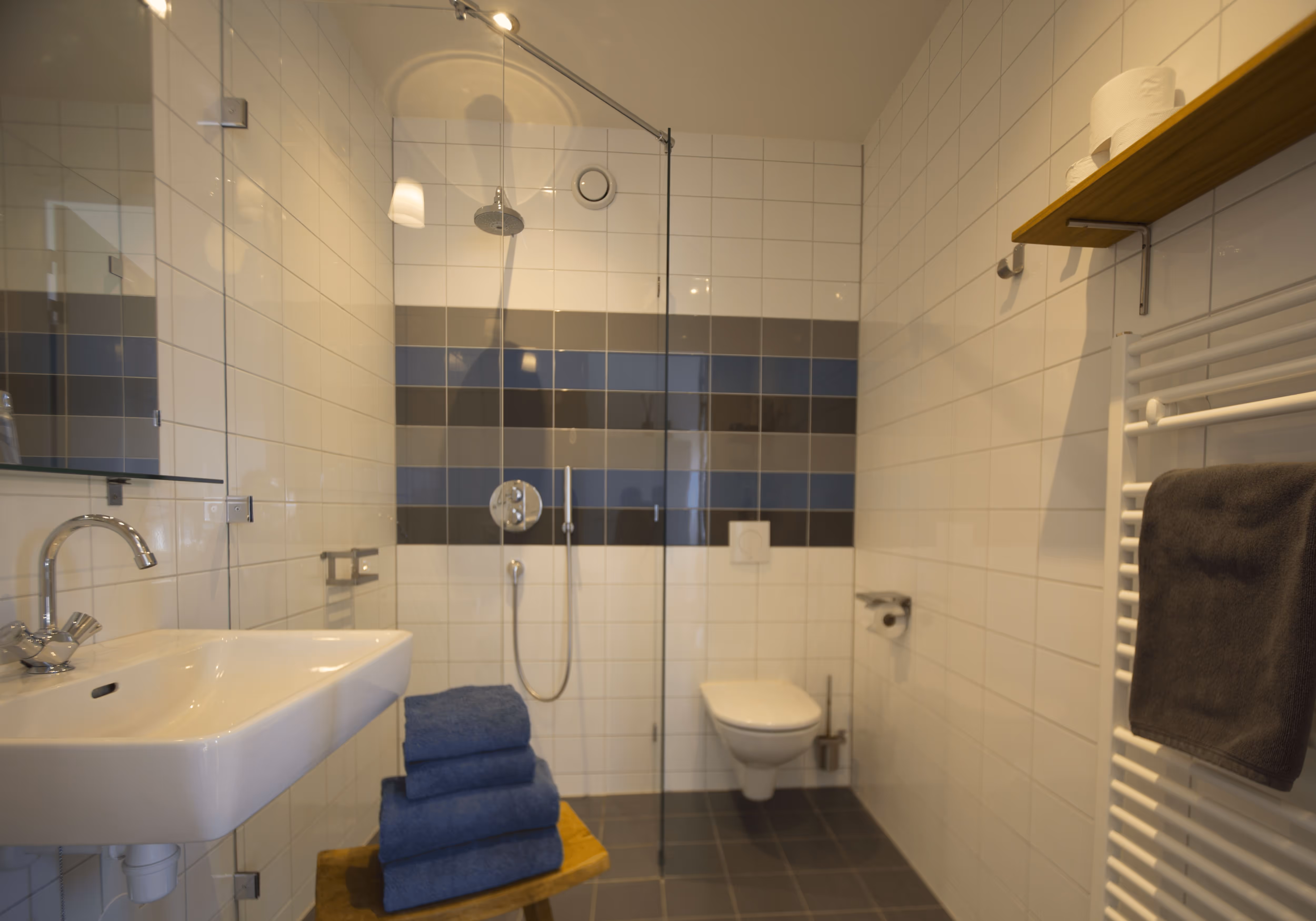 De ruime badkamer beschikt over een hand- en regendouche, wastafel en toilet. Zachte handdoeken liggen voor u klaar. De slaapkamer is gelijkvloers met de woonkamer, u slaapt in een tweepersoonsbed (1.60 x 2.10 meter) met hoogwaardige matrassen.